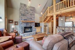 The home's extensive windows offer unparalleled mountain views, perfect for gatherings around the central fireplace or dining as the sun sets over the Spanish Peaks. The main level includes a fully equipped kitchen and a secluded bedroom suite. Upstairs, a family-friendly loft with four bunk-style twin beds and an ensuite bathroom provides a cozy retreat. The lower level houses a laundry room, an additional en suite guest room, and a charming master suite with a jetted tub and lounge chairs by the gas fireplace.
