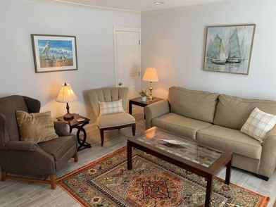 This apartment sleeps up to 5 guests and features a modern kitchen with a table that easily fits four, with an extra table leaf in the closet to expand the table if needed. The spacious living room has a queen-size pull-out couch, and all three rooms have new ceiling fans. Enjoy free shows on the 42” TV with ROKU in Guest Mode, or log in to your personal Netflix, Hulu, or Amazon Prime accounts.