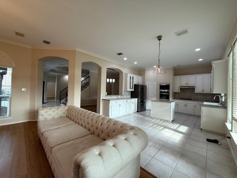 Nestled directly on the 13th fair 13th fairway of The Hills at Prestonwood Golf Course, this fully renovated 4 bedroom 3 bathroom sanctuary radiates natural light through Low-E WeatherPro windows, blending modern elegance with resort-style tranquility. Enter via a private courtyard into soaring ceilings crowned by a sleek chandelier, where an open airy floor plan seamlessly connects living spaces, including a convenient first-floor bedroom ideal for guests or a home office. The heart of the home is a chefs eat-in kitchen, freshly updated with wide-plank flooring, gleaming quartz countertops, stainless steel appliances, double ovens, a gas cooktop, herringbone marble backsplash, glass-front cabinetry, and an expansive island perfect for gatherings. The oversized primary suite offers breathtaking views of the sparkling pool with cascading waterfalls and the lush golf course beyond. Its spa-like bath features dual quartz vanities, a deep soaking tub, a frameless glass walk-in shower, and a massive walk-in closet. Two brand-new Trane AC systems ensure energy efficiency and comfort year-round, while smart home features including a full burglar alarm, door sensors, Ring cameras (tenant subscription), smart washer and dryer, and an automated irrigation system deliver effortless living with no renter maintenance required.