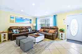 Villa Tropicana features a stylishly renovated interior with tiled floors, relaxing colors, and a well-stocked kitchen with a bar countertop and barstools. The kitchen is equipped with brand new stainless steel appliances, dishes, utensils, cookware, and coffee makers. The living room has two couches facing a 60" smart TV. The home also includes a dining room table that comfortably seats 8 guests, a laundry room with a newer washer and dryer, an iron, and an ironing board. Enjoy the private, spacious outdoor tropical backyard with a large heated pool, a BBQ gas grill, patio dining, corn hole, smart TVs, and Wi-Fi. Towels, beach towels, coolers, beach chairs, and umbrellas are provided for your convenience.