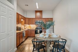 Thoughtfully designed interiors offer modern amenities and warm, inviting touches. The open-concept kitchen features a round table seating four. A washer and dryer are available for convenience. The living room offers plush seating and a TV, perfect for movies, conversation, or quiet reading.