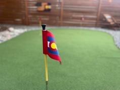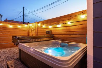 This apartment features an eat-in kitchen with a dining table for four, a dishwasher, a microwave, a TV, and a stackable washer/dryer hidden behind a barn door. The spacious living room includes a comfortable couch, a loveseat, a coffee table, and a window air conditioner. Step outside to your private backyard oasis, complete with a hot tub, a fire pit, a grill, a putting green, a hammock, and various seating areas.