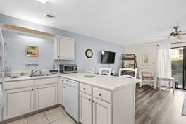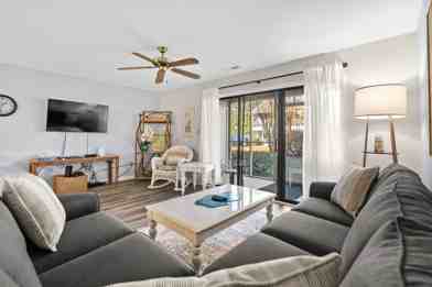 This inviting condo features a master suite with a queen bed, Roku TV, walk-in closet, and en-suite bathroom with a tub/shower combo. The second bedroom has two twin XL beds, with a second bathroom featuring a stand-up shower directly across the hallway. A fully equipped kitchen with modern appliances is adjacent to a large dining table with seating for four. The living room includes a queen sleeper sofa, loveseat, and 50" Roku TV. Enjoy the screened porch, just steps from the pool.