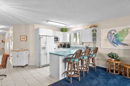This apartment features brand new carpet, a brand new living room sofa and loveseat, and a fully stocked kitchen. The primary bedroom has a queen bed and walk-in closet, as well as an attached en suite bath with a tub and bedroom and hallway access doors. The second bedroom has 2 twin beds and a full bath with a shower steps away in the hallway. The hallway connects to an open-plan living space with a kitchen, a dining table for 4 with additional bar stool seating at the peninsula kitchen counter, and a living room, complete with a comfortable brand new sofa and loveseat. Open the slider off the living space to reveal a large screened patio with a utility closet containing a washer/dryer and a view of the pool for easy access.