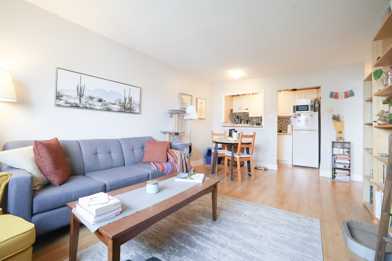 Recently installed, high-quality laminate flooring looks great and is easy to maintain. Renovated, open concept kitchen with breakfast bar! Bedroom is easily large enough for a queen bed and a couple of dressers (bed in photos is a queen).