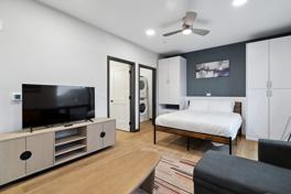 This studio apartment features inviting living areas, a fully equipped kitchen, and a bathroom complete with toiletries. You can also enjoy the resident roof deck, resident clubroom, in-unit washer and dryer, smart TV with streaming apps installed, and complimentary coffee. A TV is in the living room.