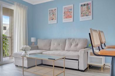 This condo comfortably sleeps up to 4 guests and features a fully stocked kitchen with cookware, utensils, and basics, a breakfast bar with 2 stools, and a high-top dining table for 2. Enjoy entertainment with a 68” smart TV in the living room and a 43” smart TV in the bedroom, both supporting streaming. A Keurig coffee maker with K-Cups, a popcorn maker with fresh popcorn, and a cocktail bar with a mixology set, whiskey decanter, and glasses are also available. The full bathroom includes a tub/shower combo and is stocked with high-quality bath and face towels, shampoo, conditioner, and body wash. Beach towels, beach chairs, and a beach umbrella are included for your convenience.