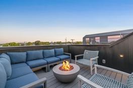 This home offers a rooftop oasis with outdoor dining, a firepit lounge, and stunning views of the Nashville skyline. The gourmet kitchen features an oversized island with seating for 7 and top-of-the-line stainless appliances. The spacious living area has an open-concept design with a smart TV, plush seating, and abundant natural light. For added convenience, there is a mini bar with mini fridge and half bath on the top level for rooftop entertaining, as well as a washer and dryer.