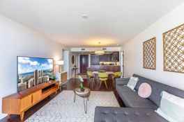 Designed for extended stays with functionality and comfort in mind, this apartment features central air conditioning, high-speed Wi-Fi, an in-unit washer and dryer, and a private lanai (balcony) with seating. The bright, open-concept living area features floor-to-ceiling windows with ocean and marina views, a flat-screen TV, and a dining table for 4. The fully equipped kitchen includes a premium Viking refrigerator and stove/oven, dishwasher and microwave, granite countertops, cookware and dishes, and a rice cooker, blender, and kettle.