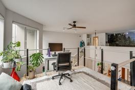 The apartment features a loft with a home office and remote work-friendly space, equipped with essential amenities for a productive work-from-home experience.