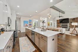 This home features a fully equipped chef’s kitchen with stainless steel appliances and seating for six at the island, a retro-style dining table, and a spacious living room with a large TV. Enjoy the landscaped backyard with a fire pit, ample seating, and a gas grill.