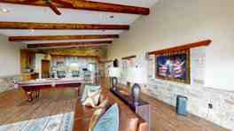 This beautifully designed home features soaring beams, stone accents, refined craftsmanship, a pool table, a spacious open living area with rustic charm, cozy decor, plenty of natural light, an outdoor seating area, and a grill.