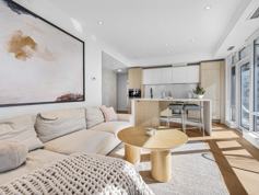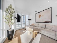 Large, renovated corner suite at 21 Widmer. This 2-bed, 2-bath layout features designer oak diagonal flooring, custom millwork with oak fronts, and a sleek chef’s kitchen with a custom island and integrated countertops. Built-in closets maximize storage. Floor-to-ceiling southwest windows and 9' ceilings flood the space with light and open to a wrap-around terrace with CN Tower and downtown views (professionally finished patio tiles). The split-bedroom plan is ideal for working-from-home or shared living. In the heart of the Entertainment District, just steps to restaurants, theatres, grocers, cafés, and multiple TTC routes. Quiet, modern, move-in ready.