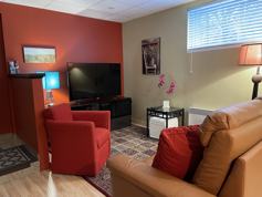 A nice living room with leather couch and a 55 inch Smart TV,.