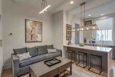 This apartment features fully stocked kitchens with bar seating, spacious living room areas, washers/dryers, smart TVs and Wi-Fi. It also features large rooftop patios.