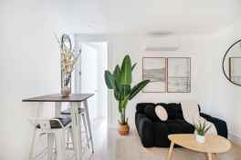 This fully furnished apartment is ideal for both short-term and long-term stays. It features 14-foot high ceilings dappled with skylights in the living room and bathroom, bringing full and natural illumination into the space. The two bedrooms each have a comfortable queen-sized bed with high-quality linens, ensuring a good night's sleep. Ample closet space is available for easy storage of your belongings. The apartment also includes a washer and dryer, high-speed Wi-Fi, and central air conditioning and heating for your comfort.