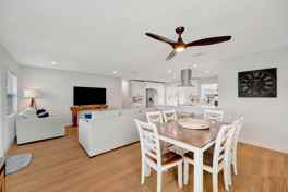 This home features a dining table for 6, stainless steel appliances, a dishwasher, range and oven, microwave, double door fridge and freezer with ice and water dispenser, drip coffee maker, wine and water glasses, seasonings, and plenty of glasses and silverware. Enjoy central air conditioning, ceiling fans, central heating, luxury vinyl flooring, a smart TV, and Wi-Fi. A hair dryer, iron, extra linens, and a washer and dryer are also available.
