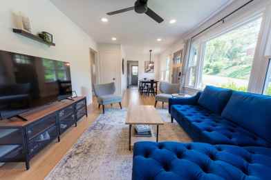 Permanent bistro lights, a fire pit, outdoor seating, and a charcoal grill are available for guest use. Firewood is provided but charcoal for the grill is not. Pets are welcome, so long as they're well-behaved and house-trained. Any "accidents" inside the house on the newly-refinished floors or new rugs will incur an additional $250 cleaning fee. There is a single off-street parking spot in the driveway, and plenty of parking on the street in front of the house. You will have access to two full kitchens, including spices and coffee essentials.