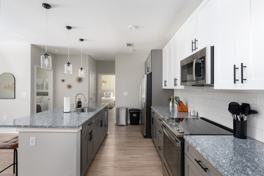 This modern apartment features hardwood floors, walk-in closets in every bedroom, an outdoor patio, an in-unit washer and dryer, a dishwasher, high-speed Wi-Fi, and central air conditioning and heating. Essentials such as towels, linens, and toiletries are provided. The fully equipped kitchen is a chef's delight with granite countertops and stainless steel appliances, including a coffee maker, toaster, kettle, and blender. The space includes a dining table with seating for six and four countertop stools. The stylish living area features contemporary furnishings and a 55” flat-screen smart TV set up with Netflix and Hulu.