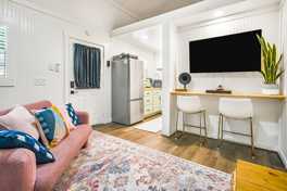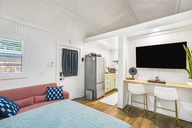 Feel at home with a state-of-the-art kitchen equipped with a Blackstone griddle, fire pit, and fast Wi-Fi. The custom-built queen-sized Murphy bed folds up to maximize space, while a 50" Smart TV provides entertainment. The kitchen features a rainwater filtration system, mini oven, induction stovetop, and a top-of-the-line mocha-master coffee maker with locally sourced fresh ground coffee.