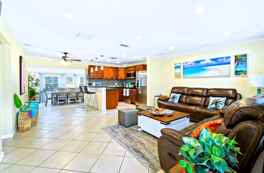Designed for fun and comfort, this home features an open kitchen and living area with stainless steel appliances, custom wood cabinets, and a breakfast bar. Relax in the comfy lounge, stream your favorites on the smart TVs, or step outside to the private tropical backyard oasis. The backyard is fully fenced and features a heated pool, BBQ grill, dining area, cornhole game, and sundeck. Beach gear, baby gear like a Pack 'n Play and high chair, a washer/dryer, smart TVs with Roku, and fast Wi-Fi are also provided.