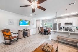 This charming coastal retreat features bright, beachy interiors with cozy furnishings and inviting spaces to gather and unwind. The fully stocked chef’s kitchen includes high-end stainless appliances, a large refrigerator, ample cabinetry and cooking space, and both Keurig and drip coffee makers. The living room offers a 55” smart TV, a large plush sofa, and leather seating.