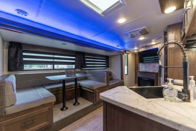 Designed for comfort, convenience, and outdoor fun, this camper/RV features a full fridge, stove, oven, microwave, and ice maker, along with dishes, silverware, and cookware. Enjoy indoor comfort with an electric fireplace and a smart TV. The bathroom has fresh towels and starter toiletries, and there's an outdoor shower for rinsing off after outdoor activities. An outdoor kitchen and BBQ grill with utensils are available for your use.
