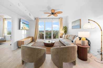 Enjoy stunning views of the Banana River and airport from your private balcony, surrounded by a nature preserve. The condo features a king-size master suite with a walk-in closet, desk space, and spa-like en-suite, a second bedroom with a queen bed and adjacent bath, and a high-end kitchen with granite countertops, state-of-the-art appliances, and sleek cabinetry. The luxurious living space includes tile flooring, a 65-inch TV, and a modern, open design throughout. Resort amenities include nature trails, a pool with speakers, a jacuzzi, a fire pit, and a waterfall for ultimate relaxation. Exclusive features include a clubhouse theater, an indoor gym with nature views, spa services, and electric car charging stations. Located next to a private airport with industry-leading soundproof construction for a quiet and serene stay.
