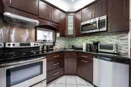 This spacious duplex features three beautifully furnished queen bedrooms, each with ample closet space. One of the bedrooms features an en suite full bathroom. There are three full bathrooms in total, two upstairs and one downstairs. The first floor features an inviting living room with a comfortable couch and a flat-screen TV. Adjacent to the living room is the dining area. The full kitchen comes equipped with modern appliances, a spacious island for meal prep, and plenty of cookware and utensils. Enjoy the convenience of an in-unit washer and dryer.