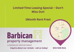 To book a viewing, call 604-948-9111 or apply online at www barbicanpm ca