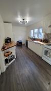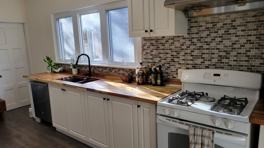 - Bright galley kitchen (9x18ft) with wood countertops, gas stove & dishwasher