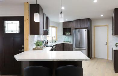 -Updated kitchen with stainless steel appliances and quartz countertops