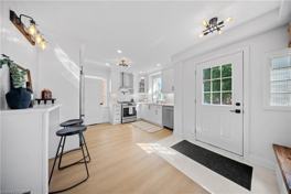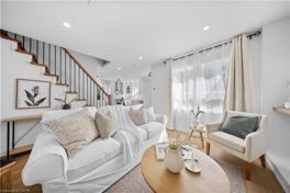 The kitchen is the heart of the home, with quartz counters, stainless-steel appliances, and a pot filler that makes cooking a joy. Natural light pours in across the warm wood floors, bringing every space to life.