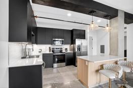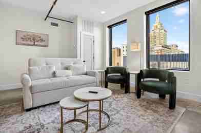 This modern industrial loft features an open layout with a cozy living area with a Smart TV and high-speed Wi-Fi, and a fully stocked kitchen. You’ll also have a combo washer/dryer in-unit, climate control, and a peaceful bedroom with premium bedding. Some historic features are kept the same, such as the concrete floors.