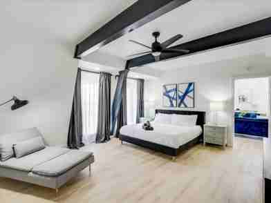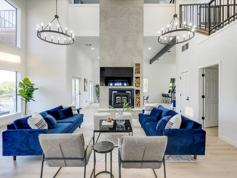 The fully equipped kitchen caters to all your cooking needs with standard-fare appliances, cooking essentials, place settings, dining utensils, a kitchen island, and wrap-around counters. The spacious living room features comfortable couches, a designer rug, coffee tables, a flat-screen TV, and high-speed Wi-Fi. The dining area offers a dining table with seating for 8+, a breakfast bar with seating for 3, place settings, dining utensils, dark drapes, and custom artwork. Enjoy the backyard with an outdoor swimming pool, jacuzzi, covered patio with an outdoor grill, lounge chairs, a hammock, and a fully fenced yard for your privacy. This vacation house also boasts two rooftop patios. Complimentary parking is available in the two-car garage, with additional space available on the spacious driveway. There is also a laundry room with a washer and dryer available.