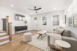 This bright, open floor plan features an open-concept living/dining area with plush seating, a large Smart TV, and a dining table for 6. The fully stocked kitchen includes new appliances and amenities. A washer and dryer are available for guest use. Enjoy the side yard with a grill and seating.