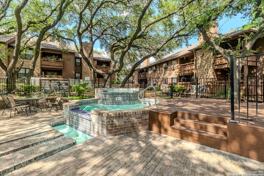 This charming two-story corner unit offers sweeping views of the sparkling pool, shaded by mature oak trees that create a private, relaxing atmosphere. The main floor features a welcoming family room with a cozy fireplace, while upstairs you'll find two bedrooms including a spacious primary suite with a large walk-in closet. Two covered patios extend the living space outdoors, one connecting directly to a convenient utility room off the primary bedroom. The community includes a tennis court, adding to the appeal for active lifestyles. Its highly desirable location near the Medical Center, USAA, shopping, and major highways including IH-10 and Loop 410 makes it an excellent choice for both everyday living.