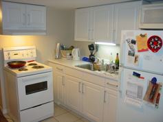 600 sq. ft apartment; kitchen includes stove, fridge, and microwave. Bathroom features a soaker tub; laundry en suite