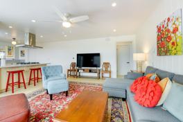 This home features two living areas, a dining table with a chandelier, and bright and modern decor. The chef's kitchen is equipped with all major stainless steel appliances, including a dishwasher, cooking basics, dishware/flatware, spices, a wine fridge, a Keurig coffee maker, and a toaster. Additional amenities include free Wi-Fi, central heating and air conditioning, a washer/dryer, an iron/board, linens/towels, and a hair dryer.