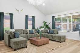 This home offers a fully equipped kitchen with stainless steel appliances including an oven, fridge, freezer, stove, microwave, and dishwasher, as well as cooking essentials and a center kitchen island. The elegant living room features a comfortable sectional, coffee table, rug, a flat-screen TV, high-speed Wi-Fi, high ceilings, and decorative greenery. There is a formal dining area with seating for 8 and a cozy breakfast nook with seating for 4, as well as place settings and dining utensils. Enjoy the cinema room with an air hockey table, large screen, and comfortable sectional seating. A laundry room has a washer and dryer available for your use.