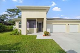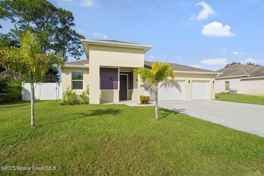 2024 Build 4 bedroom 2 bath home for rent in Northwest Palm Bay. Tile flooring throughout, open floor plan with vaulted ceilings. Spacious kitchen with stainless steel appliances and granite countertops. Covered rear patio, large fenced backyard and three car garage. Great location, close to shopping and restaurants. Lawn care included in rent.