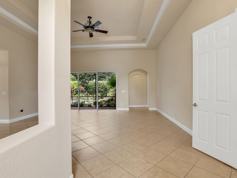 Tray ceilings, crown moulding, 8-ft doors, plantation shutters, and large beige tile throughout.
