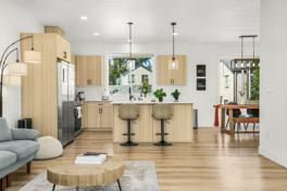 This fully furnished townhouse has a stylish and modern touch, encouraging an open concept that seamlessly blends the living, kitchen, and dining room. The kitchen is fully stocked with a spacious island with seating for three, all the essentials for cooking and baking, and a cookbook. Start your day with a fresh cup of coffee from the espresso machine. All three bedrooms are located upstairs, each thoughtfully designed and furnished with a queen-sized bed and plush mattresses. Extra pillows and bedding are available. The bathrooms are well-appointed with all the essentials. This home also features an in-house washer and dryer, brand new appliances, a 65" TV with streaming services, and high-speed Wi-Fi.