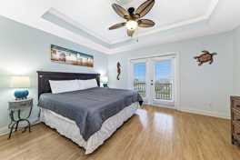 Turtle's Nest Side is a delightful 3-bedroom, 3-bathroom house located in Gulf Shores, Alabama, just one block from the beach. This spacious two-level house offers a great living area with chairs, a coffee table, and a four-seat breakfast table, providing access to the rear balcony. The main level features a guest bedroom with two twin-size beds and a private balcony with lagoon views. Upstairs, you'll find built-in bunk beds, a second guest bedroom with a queen bed, a private bathroom, a closet, and a private balcony overlooking the volleyball court with peek-a-boo views of the gulf. The master bedroom on the north side boasts a king bed, a private bathroom, a closet, and a private balcony with views of Little Lagoon.