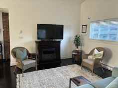 The unit is semi-furnished and includes a queen-sized bed, dining table, television, and a narrow desk in the den. Street parking is available along the front of the property.