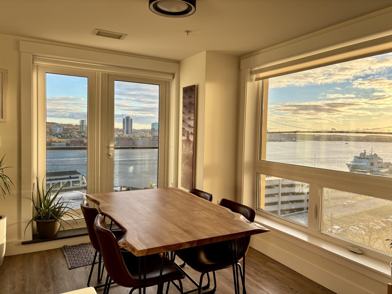 Situated along Barrington Street on the 7th floor of the building with large windows, the unit is filled with natural light, giving unobstructed views of the Halifax Harbour and beautiful sunrises.
