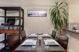 Inside, you’ll find a comfortable living area with a Smart TV, a fully equipped kitchen with full-size appliances and dining space for four, and a full bathroom with a bathtub and shower combination. The bedroom features a queen bed and large closet space. Coin-operated laundry is available within the building.