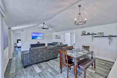 This home is fully stocked with the essentials and features a bright, open living room with two comfy couches and a mounted 56” Smart TV with standard cable. The illuminating kitchen features marble countertops, stainless steel appliances (fridge, dishwasher, sink, microwave, oven), an island with extra seating, and everything you need to prep, cook, and enjoy meals. A coffee lover’s station with drip coffee, Keurig, and French press is also available. Enjoy the attached screened-in patio with chairs and side tables or step into the spacious backyard and use the fish-cleaning table. A washer and dryer are available in the garage.