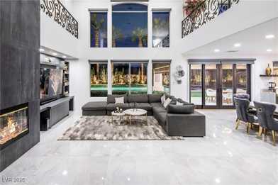 Fully furnished luxury offering a rare level of quality & design, stunning corner property has no side or front neighbors sits minutes from the Las Vegas Strip, airport, parks, shopping, top conveniences. The grand entrance features dual staircases, a private movie theater on one side, and a poker room on the other. Floor to ceiling windows frame the backyard bring natural light into the main living areas. The chef kitchen features top tier appliances & a sleek modern layout. The first floor includes a full bedroom suite plus a complete gym with a dry sauna and shower. The backyard is built for luxury living with a large lap pool that heats, a side yard with a basketball court, plenty of space to relax or entertain. Upstairs includes a pool table loft, multiple guest rooms, a primary suite with a balcony overlooking the park. The second balcony with glass railing overlooks the pool area. A move in rare opportunity for a high end lifestyle in an incredible location.