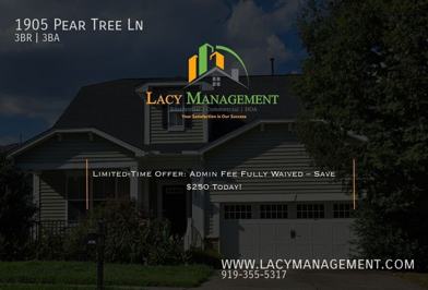 1905 Pear Tree Ln, Durham, NC is a 3 bedroom, 2 bathrooms apartment for rent. It is located in the Ed Cook neighborhood of Durham. It has apartment amenities including assigned parking, on-site laundry, walk-in closets, hardwood floor, deck, dishwasher, carpet, fireplace, air conditioning, microwave, and in-unit laundry. Cats and dogs are allowed, making it a pet-friendly apartment.